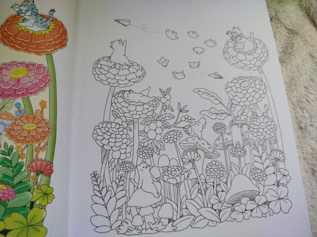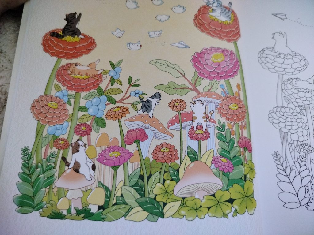 Książkę Jesienny piknik kotów bardzo starannie przemyślano. Każdą malowankę poprzedza nazwa rośliny w językach polskim i koreańskim. Dowiemy się także jaki jest czas kwitnienia i mowa kwiatów. Na przykład dziwaczek wielobarwny. Czas kwitnienia: czerwiec – październik. Mowa kwiatów: nieśmiałość, ostrożność. Wiecznik kulisty. Czas kwitnienia: lipiec – październik. Mowa kwiatów: wieczna i niezmienna miłość. Potem widzimy dwie ilustracje. Jedną w kolorze, drugą taką samą do pomalowania przez nas. Można wzorować się na pokazanym obrazku lub pomalować rysunek wedle uznania. Kwiaty są pięknie wkomponowane w różne otoczenia. Przykładowo w wesołe miasteczko, kwitnący ogród, rzekę, piękny krajobraz… Oczywiście wszystkim rysunkom towarzyszą słodkie zwierzątka.