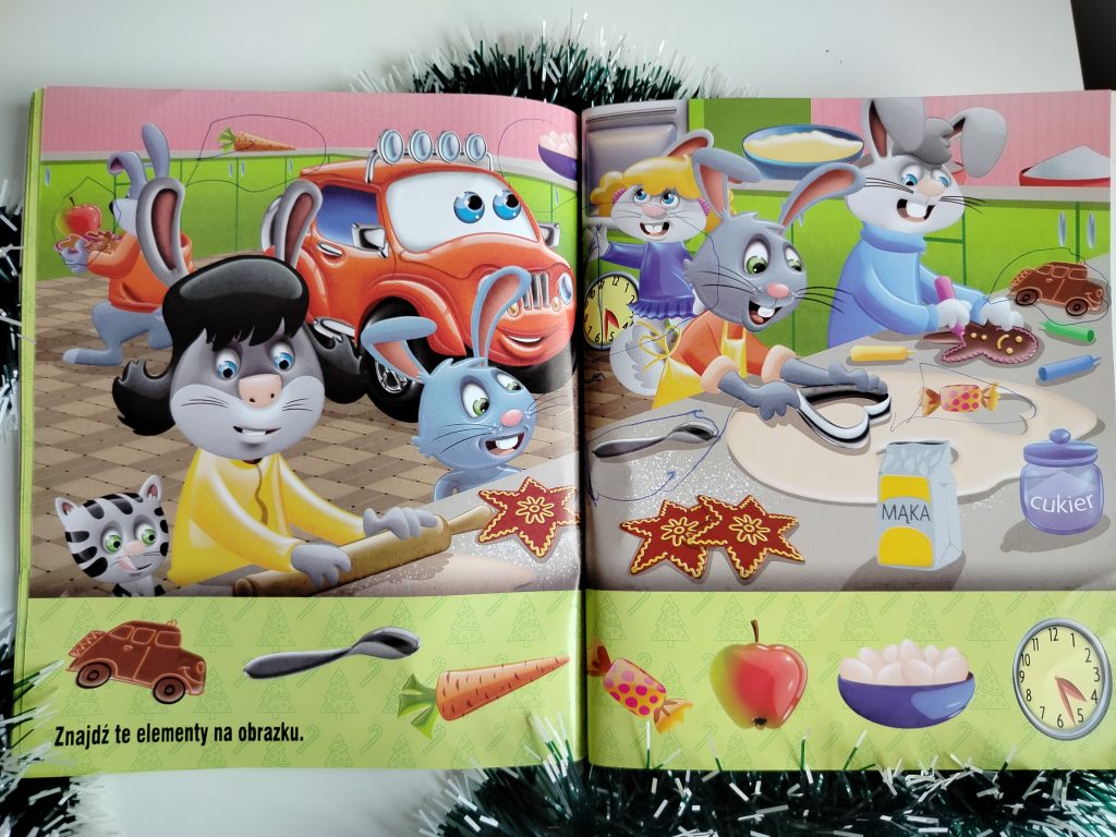 W każdej książeczce z serii „Samochodzik Franek” są na końcu zadania dla dzieci. To świetny pomysł – nauka poprzez zabawę 🙂 W książce Szykuję święta mamy różnice w obrazkach do znalezienia, uzupełnianie obrazka „puzzlami” i labirynt. Są też pytania do tekstu: Kto pojawił się w książeczce? Z kim Franek spędzał święta? Co dostał od Mikołaja? Dzięki tym zadaniom książeczka nie jest wyłącznie opowiadaniem, ale również angażującą zabawą.