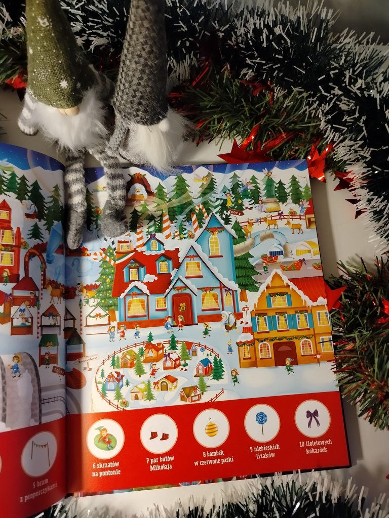 Świąteczna wyszukiwanka to pięknie wydana książeczka dla dzieci. Czas może spędzać przy niej cała rodzina. Dużym atutem różnorodność scen – od zimowych stoków, magiczny las, aż po przytulny dom Mikołaja i świąteczne miasteczko. Każda rozkładówka ma swój unikatowy klimat i zestaw elementów do odszukania. To publikacja, która łączy świetną zabawę z rozwojem ważnych umiejętności. Ja jestem nią oczarowana.
